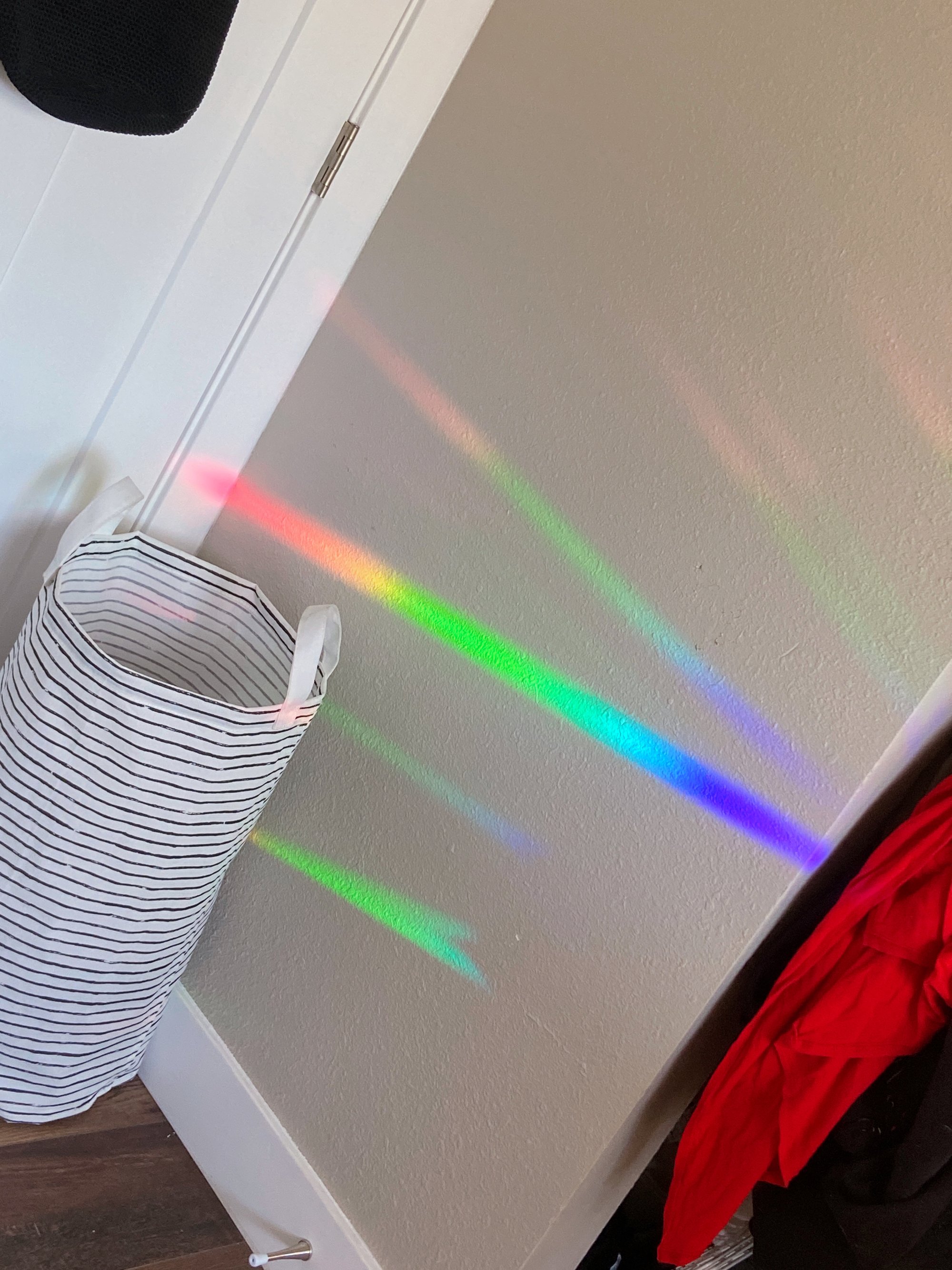 This is a suncatcher sticker that can create rainbows when direct sunlight is reflected through it. The intensity and amount of rainbows are dependent on how much direct sunlight goes through the sticker. Non-direct sunlight may create small rainbows and overcast weather will create a shimmery effect on the sticker.
