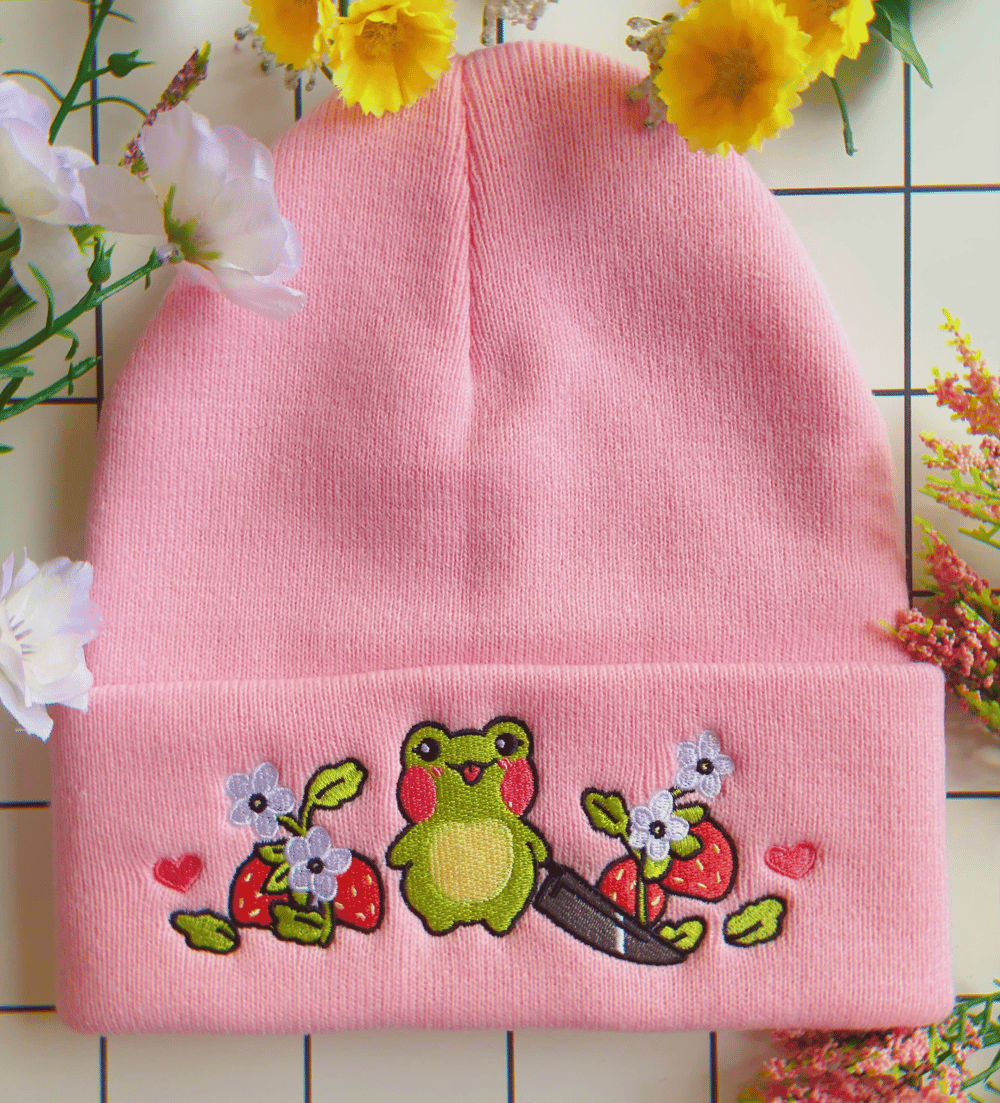 A cute frog on a light pink beanie.