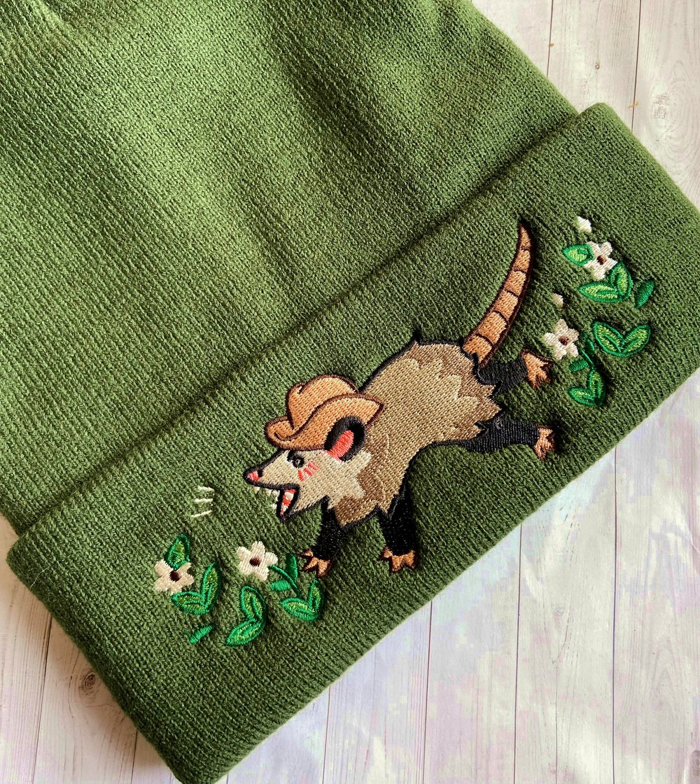 Warm and comfortable beanie with a cowboy-hat wearing possum and their flowers. All artwork is done and designed by me. For more options check out my site: https://www.sleepyrogue.com/