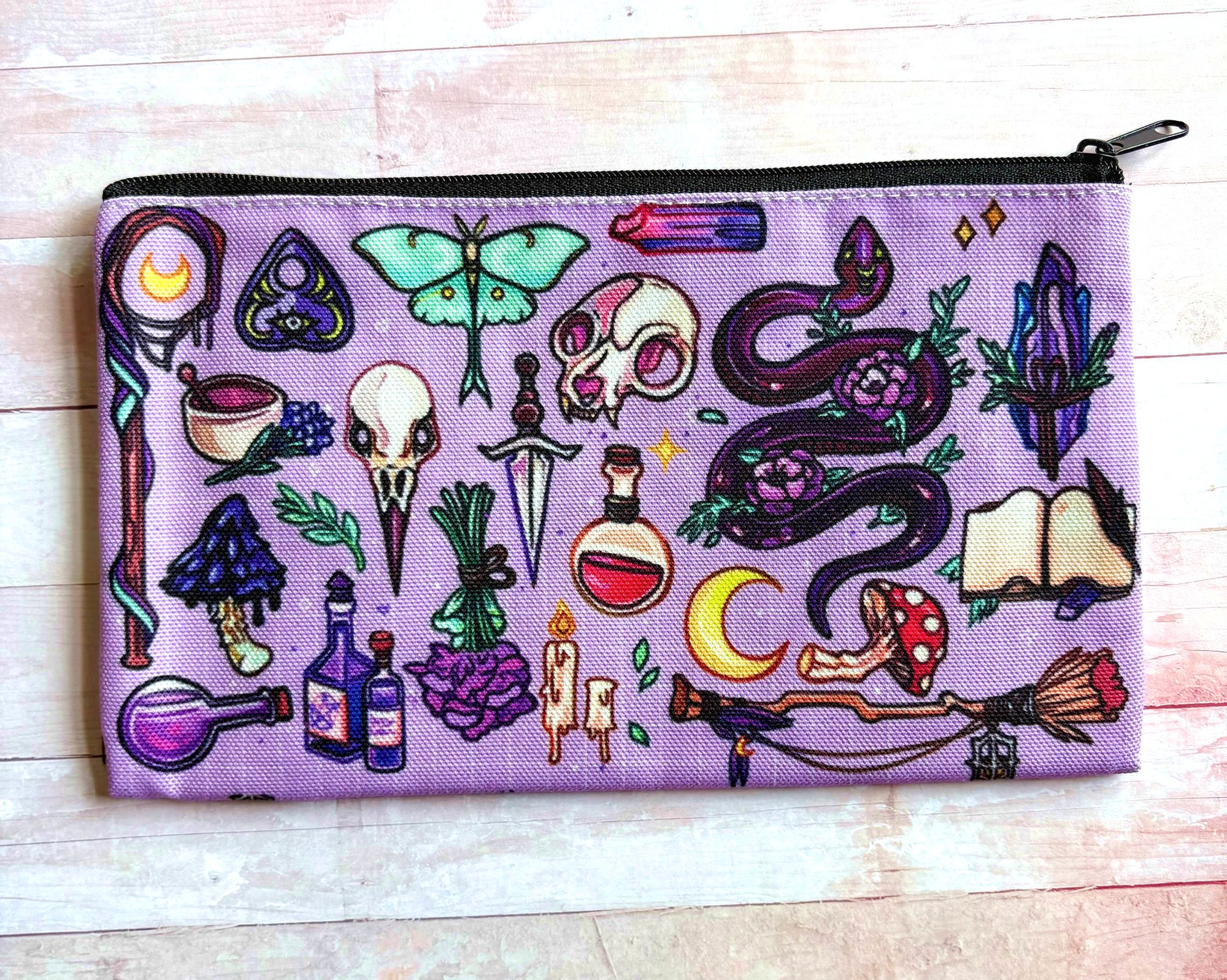 ♡ Canvas pencil bag with a black zipper and black fabric lined interior. The same design is on both sides of the bag.